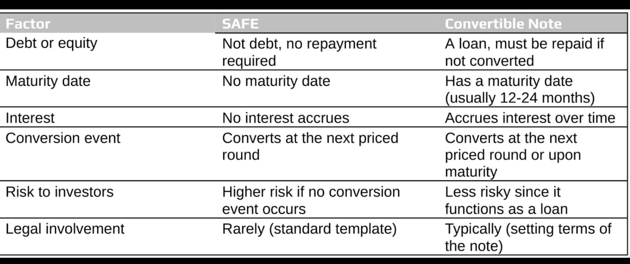 A convertible note is a more traditional fundraising tool that operates similarly to a SAFE but with a few key differences. Unlike a SAFE, a convertible note is debt. It functions like a loan with a maturity date and accrues interest over time.